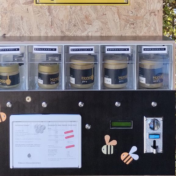 Direkt vor unserer Tür erwartet dich unser Honigautomat, rund um die Uhr frisch befüllt mit unserem cremigen Honig.